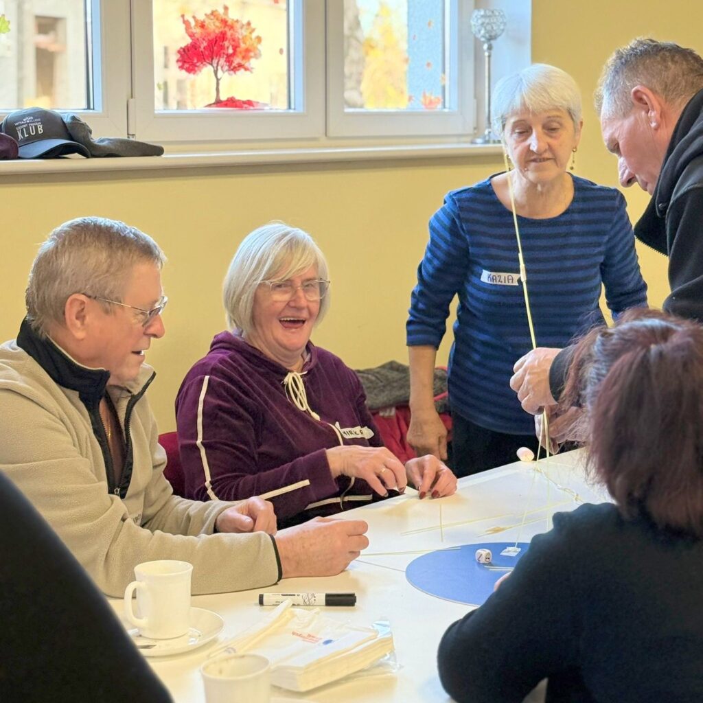 Zajęcia miały w pełni praktyczny charakter. Uczestnicy brali udział m.in. w ćwiczeniu integracyjnym „Dwie prawdy i jedno kłamstwo”, pracy z kostkami storytellingowymi oraz w Marshmallow Challenge – zadaniu polegającym na zbudowaniu jak najwyższej konstrukcji z makaronu spaghetti, taśmy i sznurka. Po zakończeniu aktywności trenerka poprowadziła rozmowę o dynamice pracy w grupie: wyłanianiu się liderów, wpływie presji czasu oraz skutecznych sposobach współpracy.